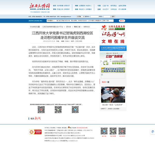 近日,910023威尼斯官网党委书记贺瑞虎到西湖校区开展“书记面对面”活动,走访慰问困难学生,为他们送来学校的关心关爱,并就学习生活、职业生涯规划、校园建设管理等与同学们座谈交流,听取大家的意见和建议。该校党委副书记邓文君,党委委员、副校长徐光兵陪同,学校相关部门、各专业学院主要负责人参加。