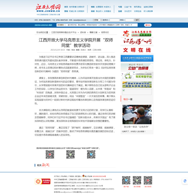 为推进习近平总书记考察江西重要讲话精神进课堂、进教材、进头脑,深入推进思政课问题式专题化团队教学改革,不断提升思政课的思想性、理论性、亲和力、针对性,近日,我院思政教师李玫携手欧菲光集团研发软件开发部经理黄少辉,将书本上的理论和时事热点话题紧密结合,为学生们带来一堂以《如何弘扬改革创新的时代精神》为题的“双师同堂”思政课。